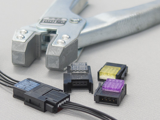 ●特殊治工具不要、電線前処理不要(省工数)、電線を入れて プライヤーでかしめるだけの簡単・確実な一括圧接コネクタ